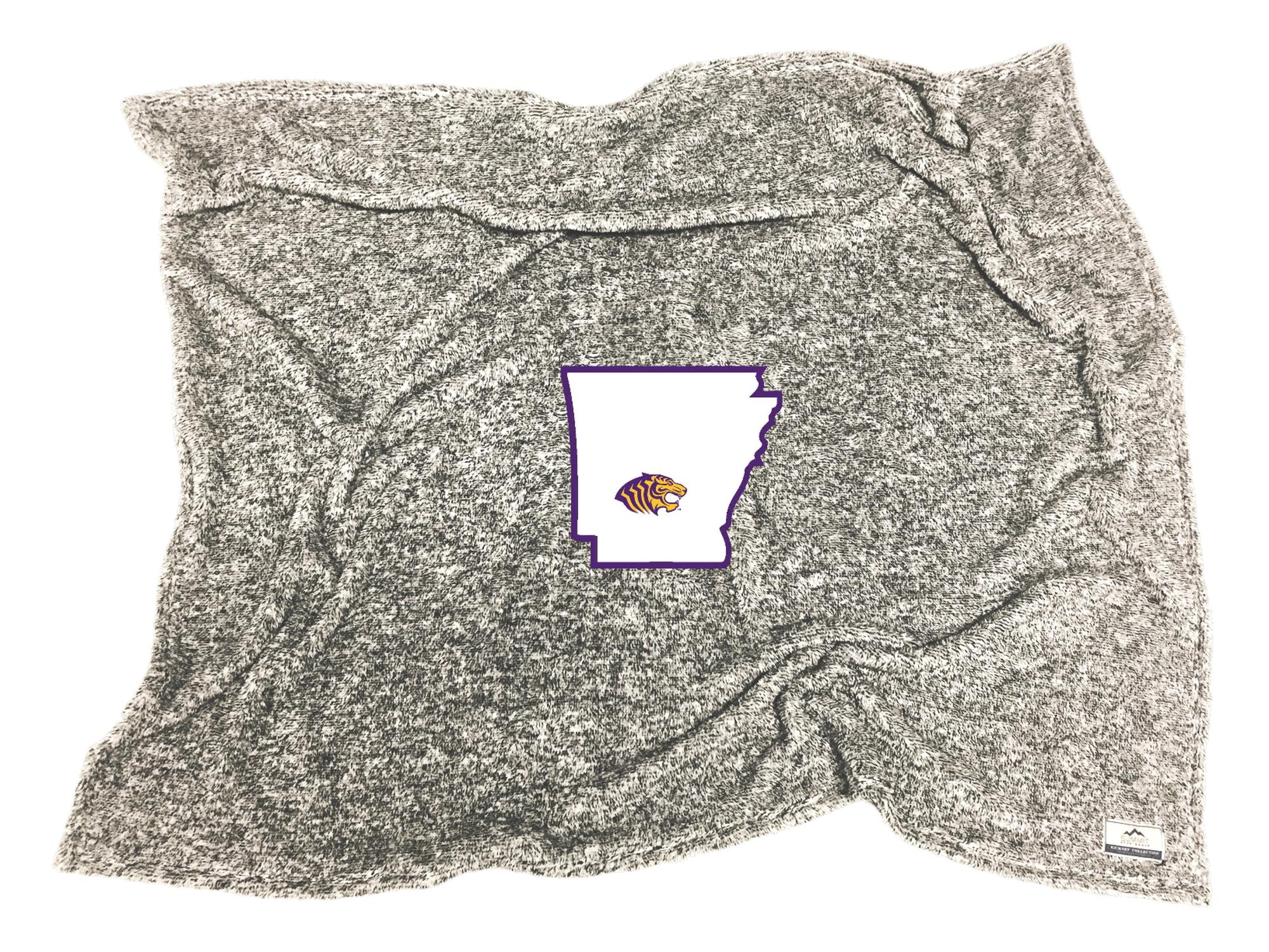 Cuddle up with our Flecked Double Plush Blanket! Featuring a soft applique with the State of Arkansas and our Tiger head logo. 50"x60"