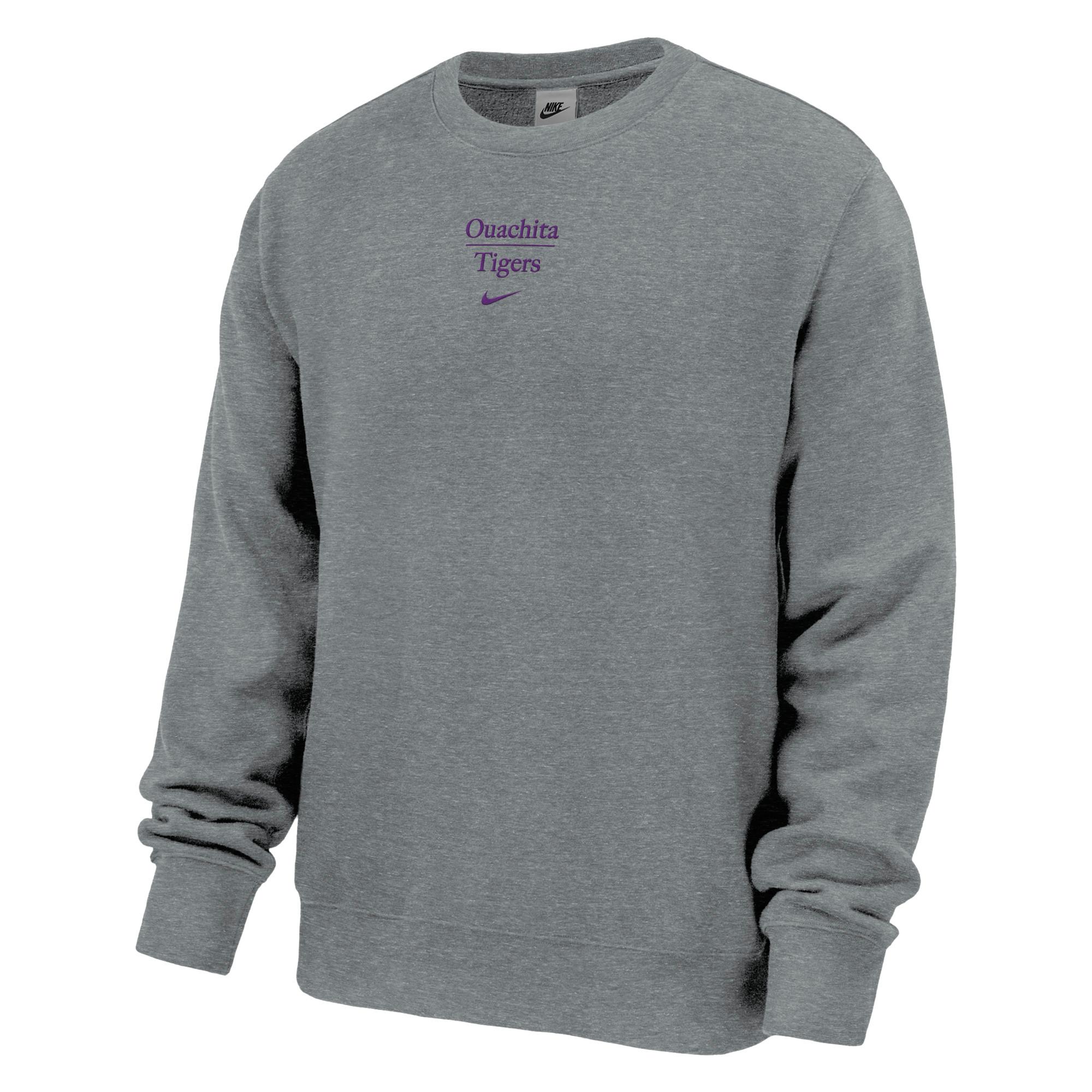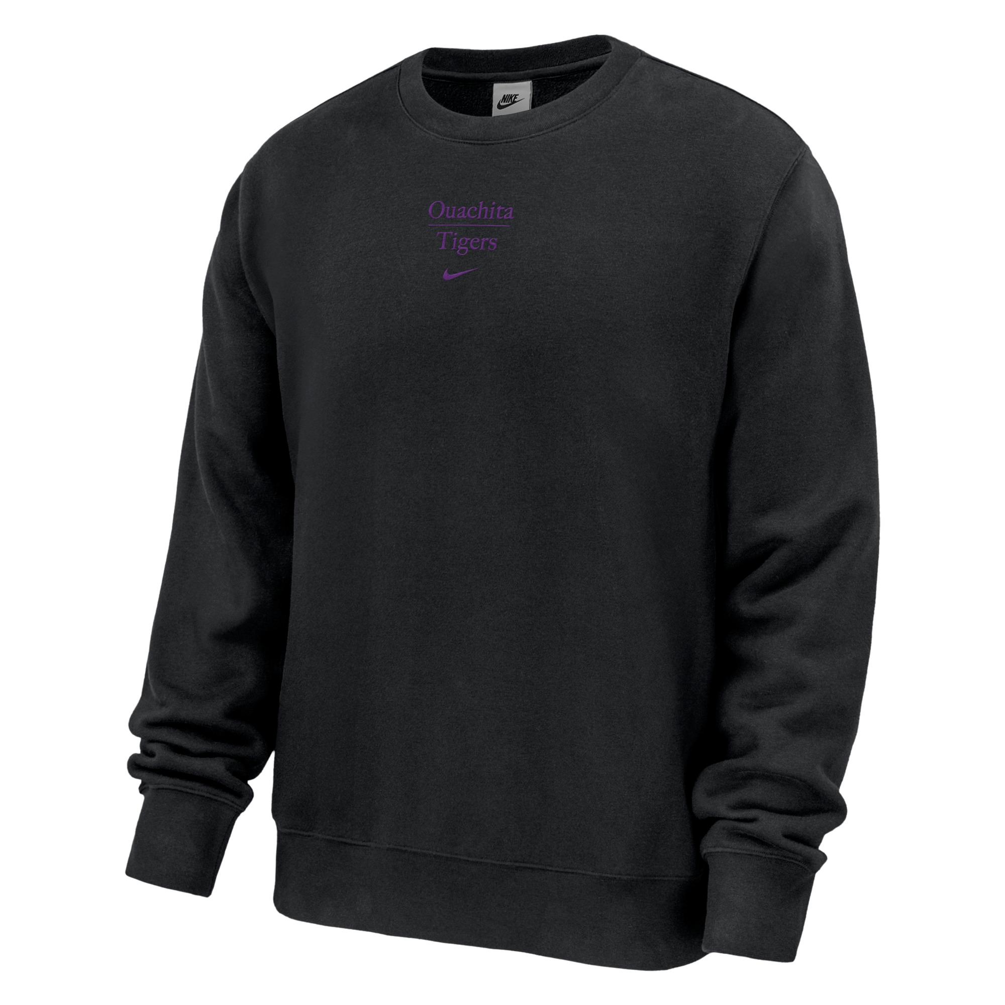 Ouachita Tigers apparel, Nike fleece crew, college fan gear, OBU sweatshirt, team spirit clothing.