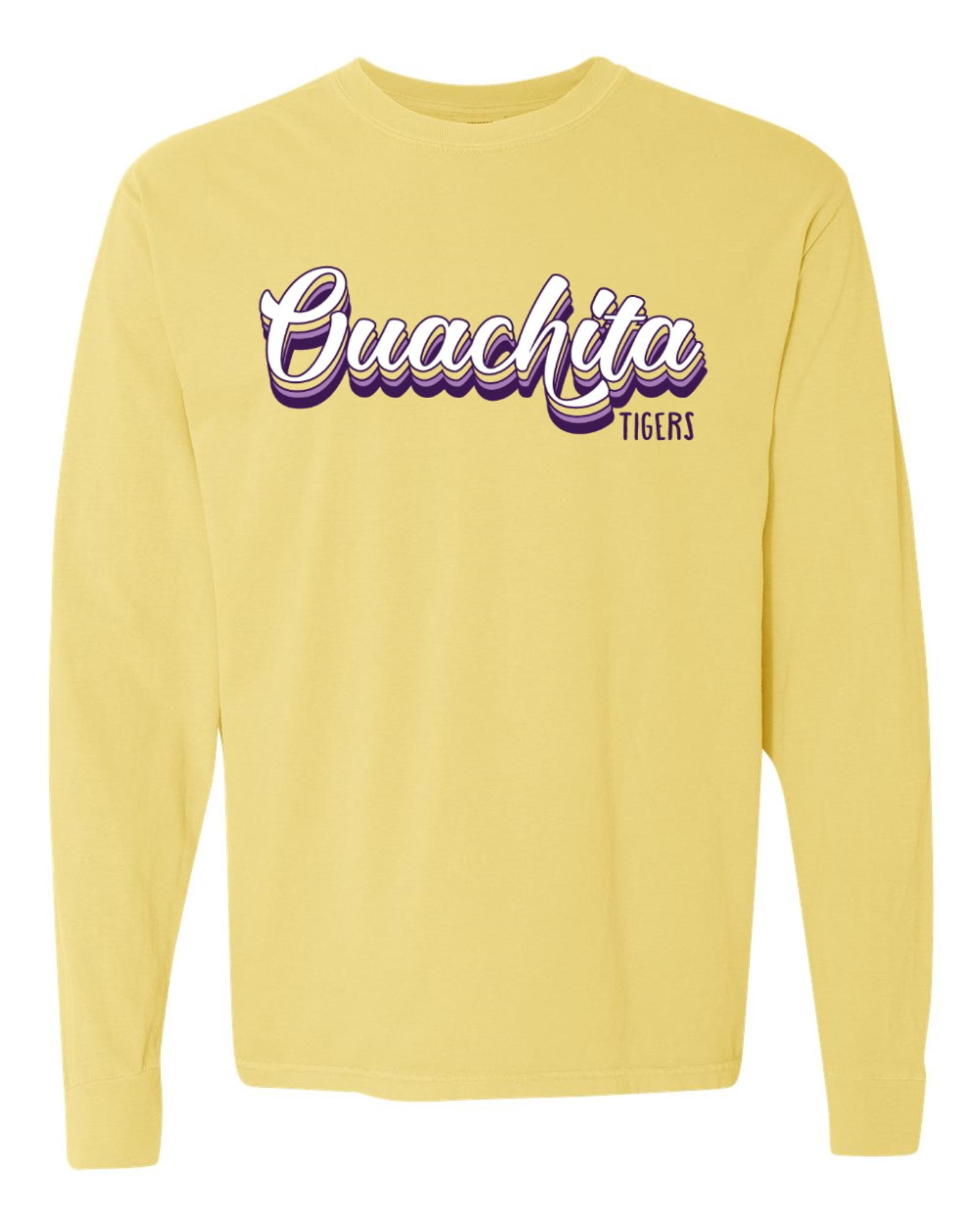 We love this classic long sleeve gray tee with a cursive script "Ouachita" on the front!